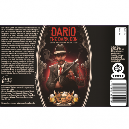 Dario the Dark Don är en väldigt kraftfull och smakrik Double Mash Russian Imperial Stout. Värmande och dekadent! Receptet står Jacob på Amager för.